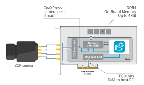 在Coaxlink FPGA內(nèi)部,所有數(shù)據(jù)流接口都基于AMDA AX14流協(xié)議。在源端,用戶邏輯接收從CXP相機(jī)獲取到的圖像,在目標(biāo)端,數(shù)據(jù)流接口將由用戶邏輯生成的結(jié)果圖像或數(shù)據(jù)傳輸?shù)絇CI Express DMA后端通道,DMA傳輸系統(tǒng)可以直接將數(shù)據(jù)在外設(shè)和內(nèi)存之間進(jìn)行高速傳輸,節(jié)省CPU的占用,從而使圖像處理獲得更多計(jì)算資源。此外,多達(dá)4G的DDR4板載內(nèi)存也可以用于存儲中間數(shù)據(jù)和系數(shù)。