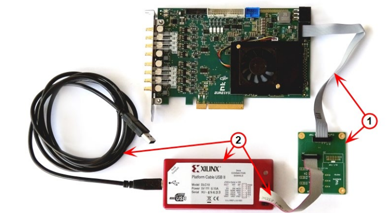 CustomLogic開發(fā)工具為Xilinx的Vivado套件,使用的FPGA為Kintex Ultrascale XCKU035,用戶可以使用該FPGA 70%的邏輯資源。通過3613 JTAG適配器Xilinx編程器(圖中①所示)連接到Coalink FPGA進(jìn)行調(diào)試。